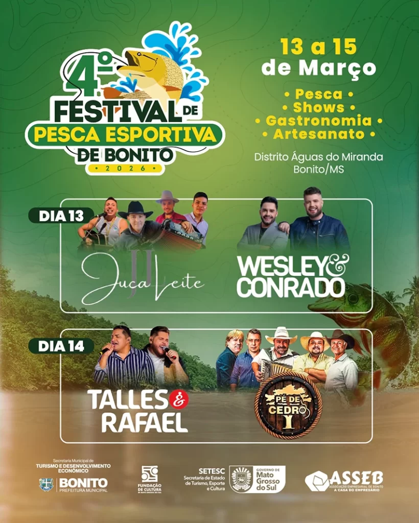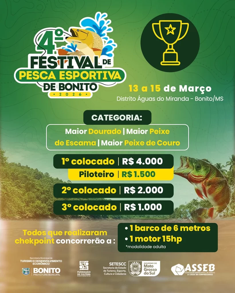 A Prefeitura de Bonito realiza, entre os dias 13 e 15 de março de 2026, o 4º Festival de Pesca Esportiva de Bonito no Distrito Águas do Miranda. O evento reúne pescadores, moradores e visitantes em uma programação que combina esporte, cultura e lazer, fortalecendo o turismo e valorizando as tradições da região.