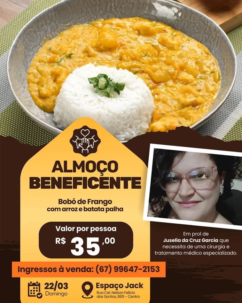 Uma família de Bonito promove, neste domingo, um almoço beneficente em prol de Juselia da Cruz Garcia, que precisa passar por uma cirurgia e dar continuidade a um tratamento médico especializado. A ação solidária busca arrecadar recursos para custear os procedimentos e mobiliza a comunidade em apoio à causa.