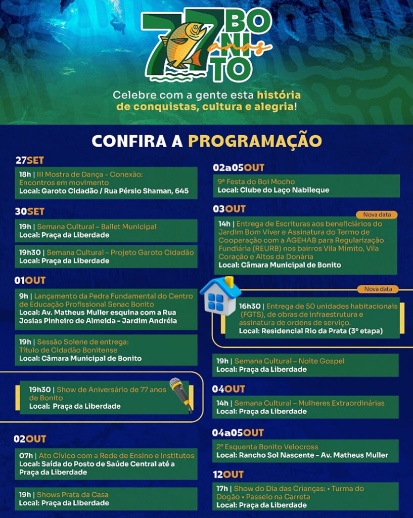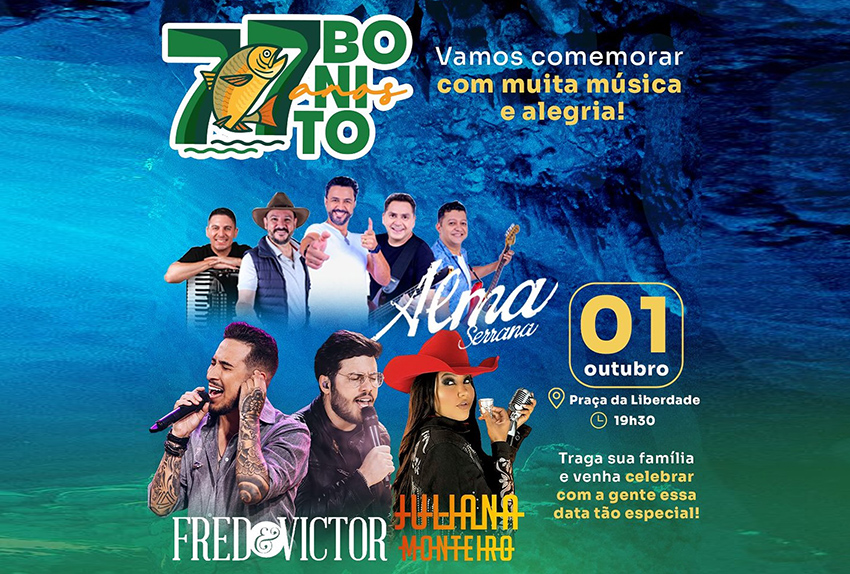 Bonito se prepara para comemorar seus 77 anos de emancipação política com uma grande festa na véspera do aniversário, dia 1º de outubro (quarta-feira). A partir das 19h30, a Praça da Liberdade será palco de uma noite especial com os shows gratuitos de Juliana Monteiro, Alma Serrana e Fred & Victor, que prometem embalar o público com muita música e animação.