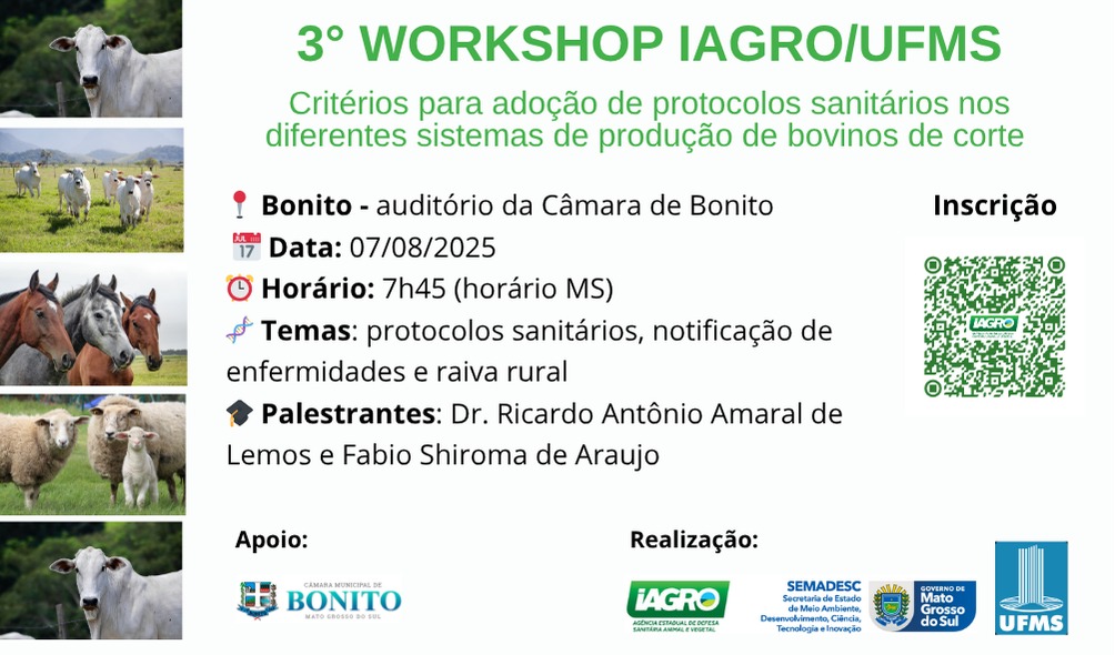 Na próxima quinta-feira, 07 de agosto, Bonito-MS sediará o 3º Workshop Iagro/UFMS, com o tema “Critérios para adoção de protocolos sanitários nos diferentes sistemas de produção de bovinos de corte”. O evento será realizado no auditório da Câmara Municipal de Vereadores, com início às 07h45 e entrada gratuita, reunindo produtores rurais, médicos veterinários, estudantes e profissionais da área da saúde animal.