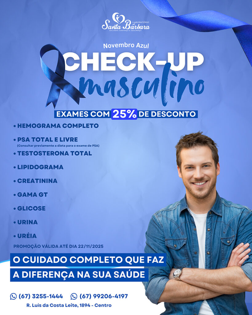 O Laboratório Santa Bárbara está oferecendo 25% de desconto em uma série de exames essenciais para o check-up masculino, em alusão ao Novembro Azul. A campanha, válida até o dia 22 de novembro, inclui exames como Hemograma completo, Ureia, Creatinina, Lipidograma, Glicose, Gama GT, Testosterona Total, PSA Total e Livre, além de exame de Urina. A iniciativa busca reforçar a importância da prevenção e do diagnóstico precoce, incentivando os homens a cuidarem mais da própria saúde.