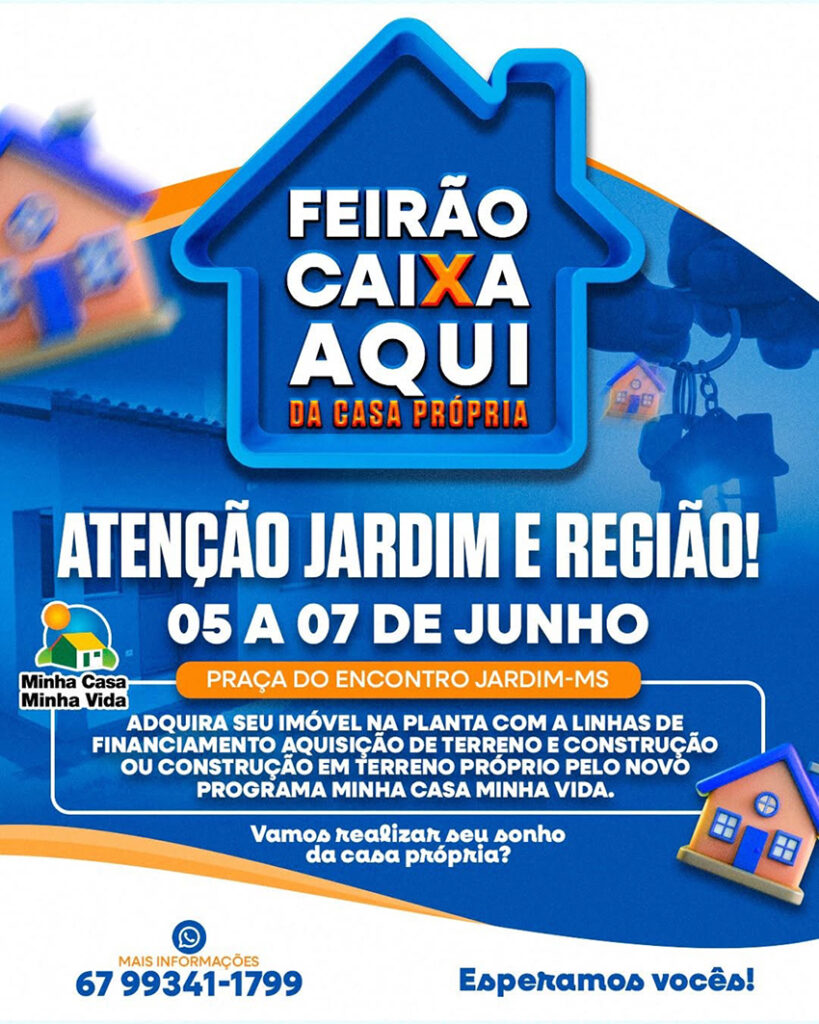 Entre os dias 05 e 07 de junho, a população de Jardim e região terá uma grande oportunidade para realizar o sonho da casa própria. A Praça do Encontro será palco do Feirão Caixa Aqui da Casa Própria, uma ação que reúne construtoras, especialistas em crédito habitacional e opções de financiamento acessíveis, especialmente pelo programa Minha Casa Minha Vida.