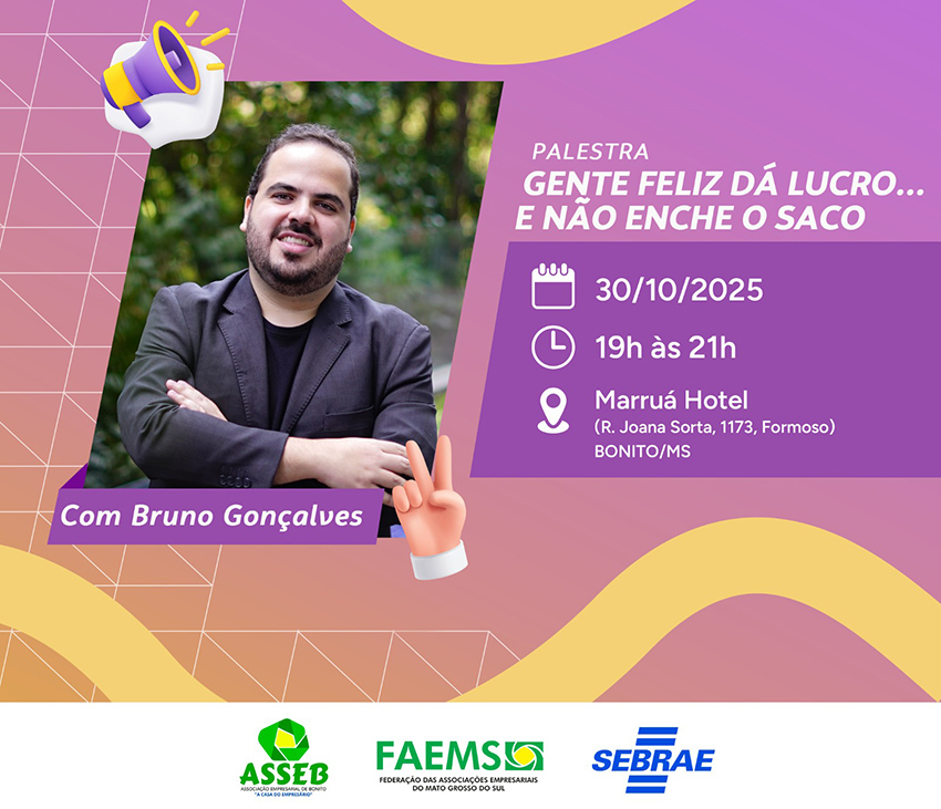 A Associação Empresarial de Bonito (ASSEB) promove no dia 30 de outubro, às 19h, no Marruá Hotel, a palestra “Gente feliz dá lucro… e não enche o saco”, com o especialista em experiências memoráveis e fundador da UAU Business, Bruno Gonçalves. O evento promete uma noite inspiradora e cheia de aprendizados para empreendedores e gestores que desejam fortalecer suas marcas e melhorar o relacionamento com clientes e equipes.