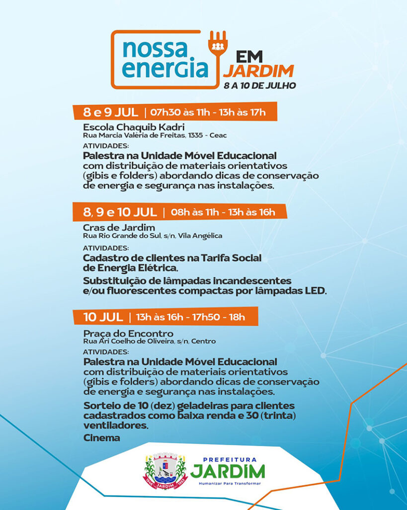 Entre os dias 8 e 10 de julho, a cidade de Jardim será palco de uma grande ação voltada à educação, sustentabilidade e economia de energia elétrica. Trata-se do Projeto Nossa Energia, uma iniciativa da Energisa em parceria com a Prefeitura Municipal de Jardim. Durante três dias, a população poderá participar de atividades educativas, receber orientações sobre o uso consciente da energia e ainda ter acesso a benefícios como substituição de lâmpadas e sorteio de eletrodomésticos.