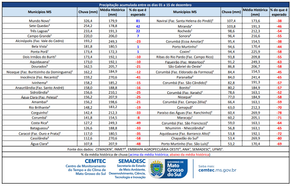 Na primeira quinzena de dezembro, em apenas três pontos monitorados pelo Cemtec/MS a quantidade de chuvas ultrapassou a média. Foram em Mundo Novo, onde choveu 326,4 milímetros entre 1º e 15 de dezembro (eram esperados 179,9mm); em Sete Quedas (choveu 254,2mm e a média é 178,8mm) e em Três Lagoas (233,4mm contra média de 191,3mm). Em Campo Grande, Bela Vista e Ponta Porã, as chuvas no período ultrapassam em muito pouco a média (7mm na Capital e apenas 1mm nas outras duas cidades).