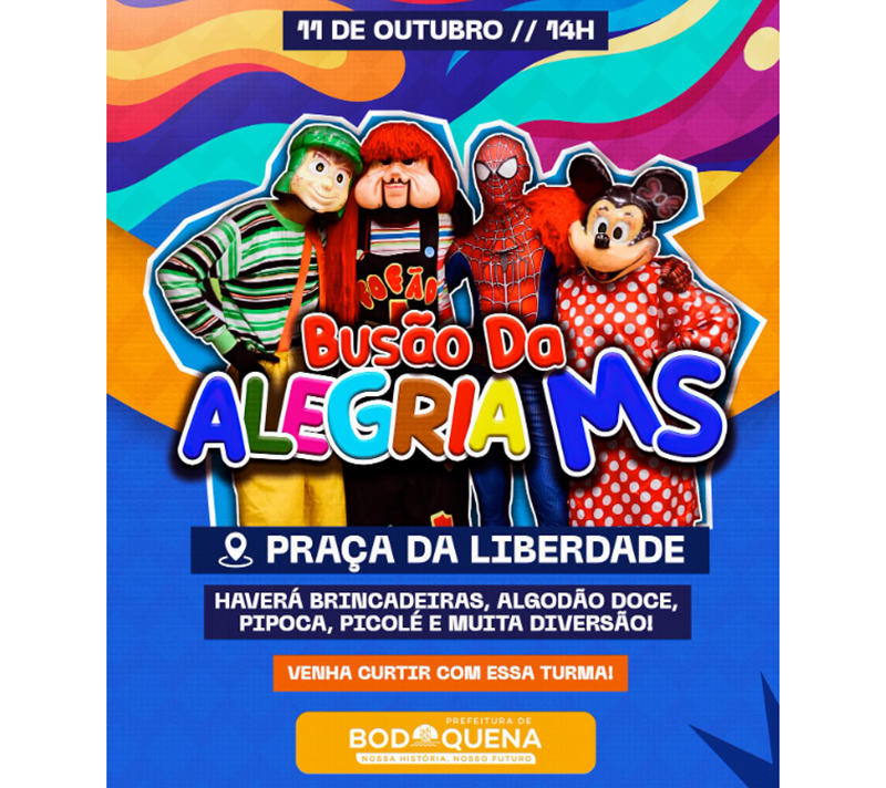 A grande atração será o Busão da Alegria MS, que chega à cidade trazendo personagens divertidos, atividades interativas e uma programação contagiante. Além disso, não vão faltar pipoca, algodão doce e picolé, tudo preparado com muito carinho para garantir a felicidade dos pequenos.