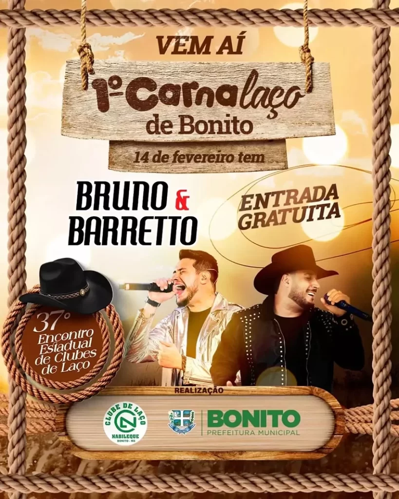A Prefeitura de Bonito confirmou uma atração nacional para o 1º Carnalaço de Bonito: a dupla Bruno e Barretto. O evento acontece de 12 a 15 de fevereiro no município.