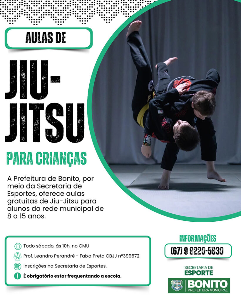 A Prefeitura de Bonito, por meio da Secretaria Municipal de Esportes, está promovendo aulas gratuitas de Jiu-Jitsu para alunos da rede pública com idades entre 8 e 15 anos. A iniciativa visa incentivar a prática esportiva e oferecer uma atividade complementar que desenvolva disciplina, foco e autoconfiança nas crianças e adolescentes.