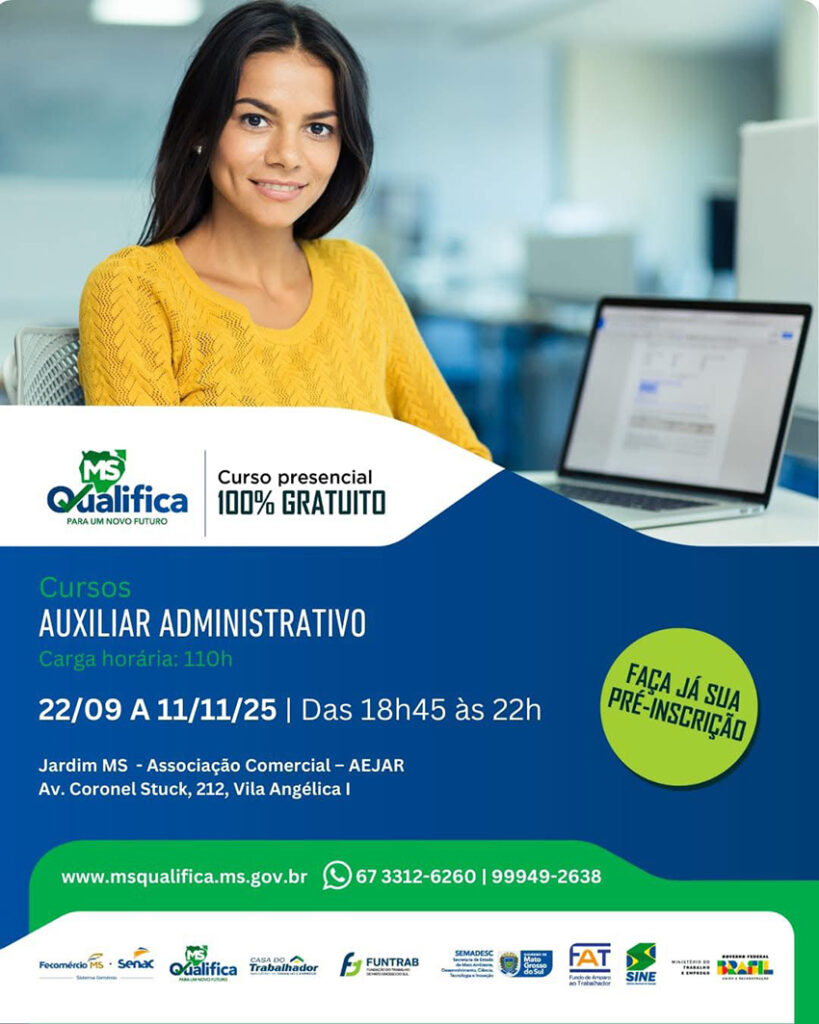 Entre as opções disponíveis, está o curso de AUXILIAR ADMINISTRATIVO, que será realizado entre os dias 22 de setembro e 11 de novembro de 2025, no período noturno, das 18h45 às 22h. As aulas acontecerão na Associação Comercial – AEJAR, localizada na Avenida Coronel Stuck, 212, Vila Angélica I. Para mais informações, os interessados podem entrar em contato pelos telefones (67) 3312-6260 ou (67) 99949-2638.