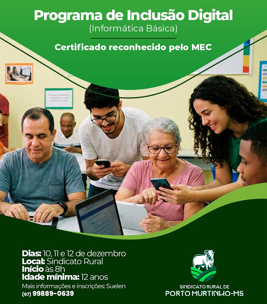 O Sindicato Rural de Porto Murtinho está com inscrições abertas para o curso gratuito de Informática Básica, uma oportunidade para quem deseja aprender os principais conceitos do uso do computador e se preparar melhor para o mercado de trabalho. A capacitação integra o Programa de Inclusão Digital e oferece certificado reconhecido pelo MEC.
