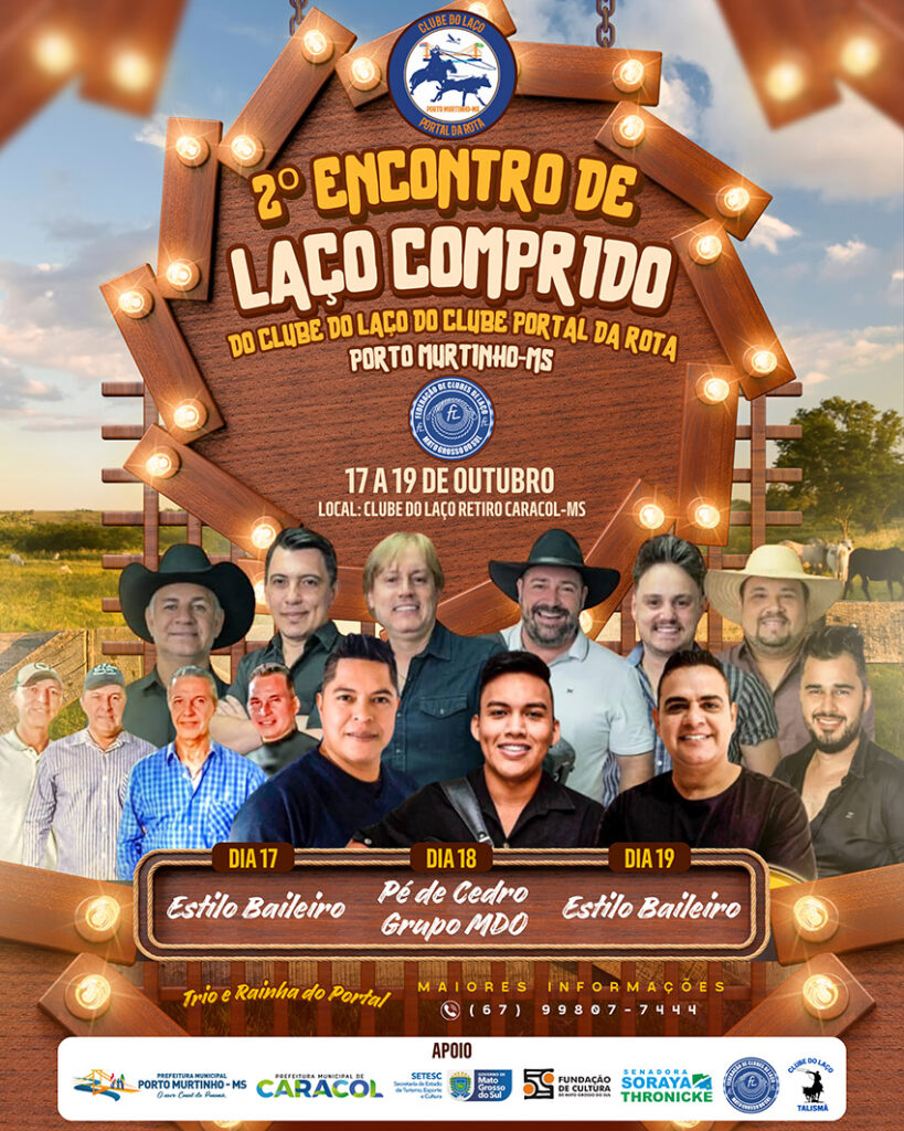 De 17 a 19 de outubro, a cidade de Caracol-MS será palco do 2º Encontro de Laço Comprido do Clube Portal da Rota de Porto Murtinho, um dos eventos mais aguardados do calendário tradicionalista da região. O fim de semana promete ser de celebração às raízes pantaneiras, reunindo competidores e famílias de diversas cidades para prestigiar esse esporte que alia técnica, tradição e paixão.